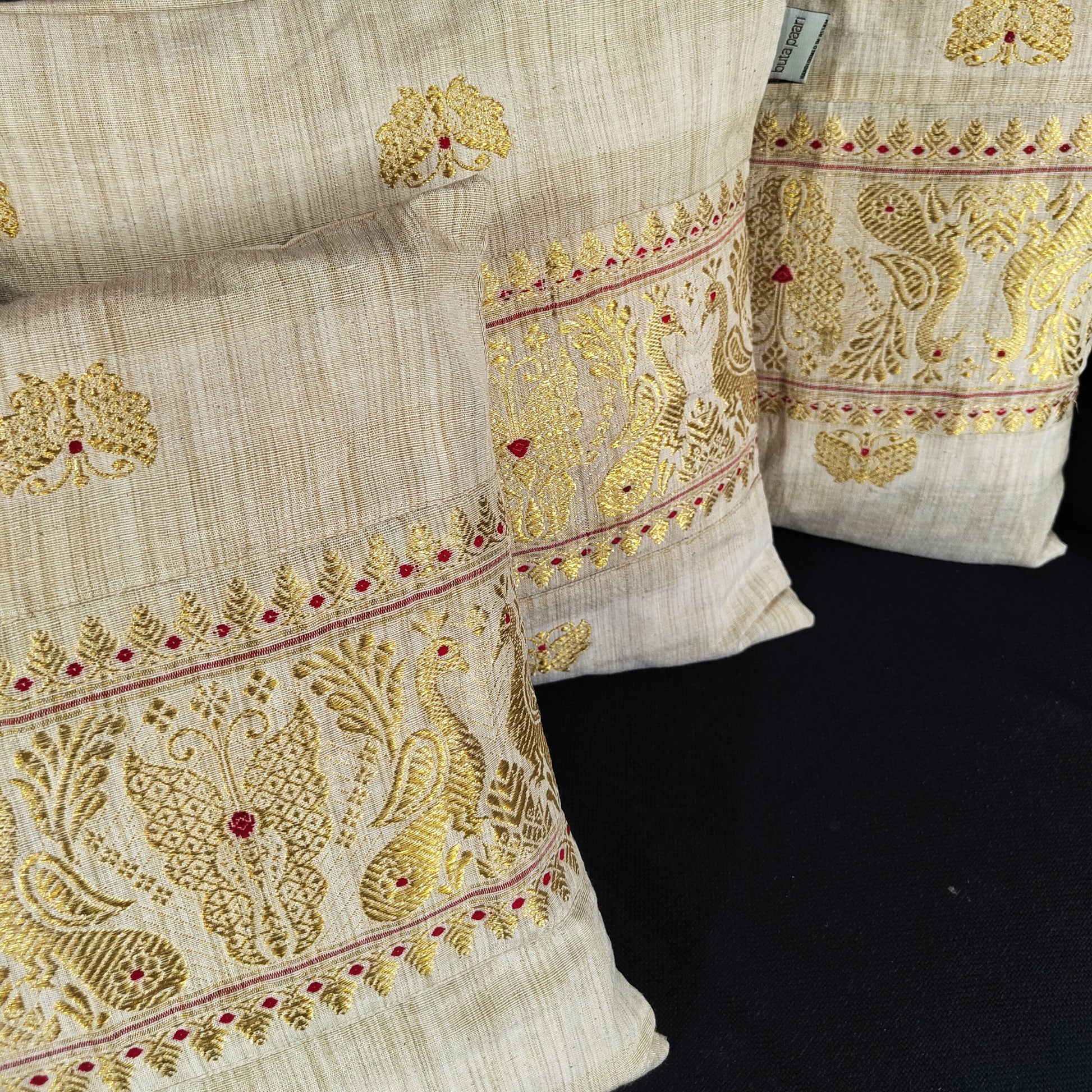 “Each cushion cover is handloom woven by women artisans in Assam. Slight variations in weave and color are a mark of the handmade process, making every piece unique. Your purchase supports sustainable craft and fair wages.”